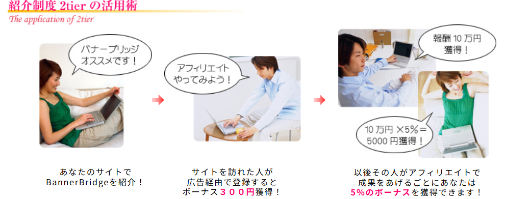 BannerBridgeは、従来の広告リンク設置型アフィリエイトを進化させた「2-tier(ツーティア)制度」を採用しており、通常の成果報酬に加えて、自分が紹介したアフィリエイターの成果に応じて追加報酬を得ることができます。