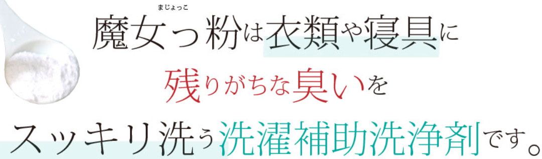 衣類や寝具に残るニオイは、毎日の生活の中で気になる悩みのひとつです。特に加齢臭や体臭は、通常の洗濯では落としきれないケースも少なくなく、洗い上がりの清涼感に満足できない方も多いのではないでしょうか。そこで注目されているのが、洗濯に加えることでニオイ悩みを軽減する洗濯補助洗浄剤「魔女っ粉」です。