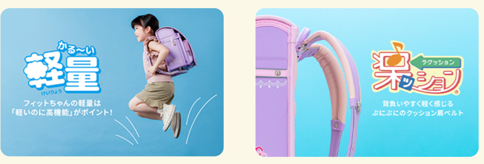 多くの実績を持つフィットちゃんブランドは、品質面での信頼度が高く、初めてランドセルを購入する方にも安心です。背負いやすさ・耐久性・デザイン性のバランスが取れており、長期間使用するランドセルに適しています。